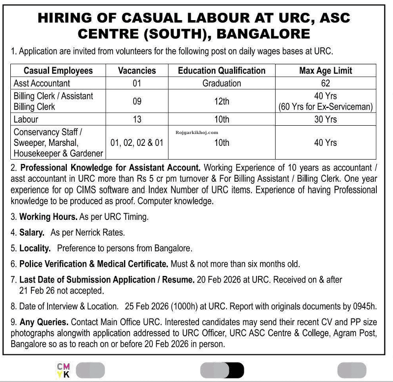Army ASC Centre Recruitment 2026 अंतर्गत ASC Centre (South), Bangalore येथील URC (Unit Run Canteen) मध्ये विविध कॅज्युअल (दैनिक वेतनावर) पदांसाठी अधिकृत भरती जाहीर करण्यात आली आहे. अकाउंट्स, बिलिंग, लेबर आणि हाऊसकीपिंग क्षेत्रातील पात्र उमेदवारांसाठी ही उत्तम रोजगार संधी आहे. ही भरती कायमस्वरूपी सरकारी पदासाठी नसून Daily Wages Basis वर आधारित आहे; तरीही संरक्षण संस्थेअंतर्गत काम करण्याचा अनुभव आणि शिस्तबद्ध कार्यसंस्कृती यामुळे या भरतीकडे मोठ्या प्रमाणात लक्ष वेधले जात आहे.