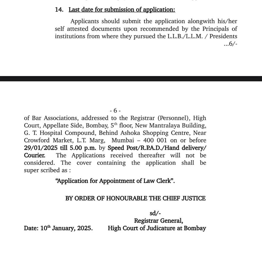 अर्ज एका लिफाफ्यात ठेऊन पाठवावा आणि लिफाफ्यावर स्पष्टपणे “Application for Appointment of Law Clerk” असे लिहिलेले असावे.