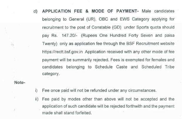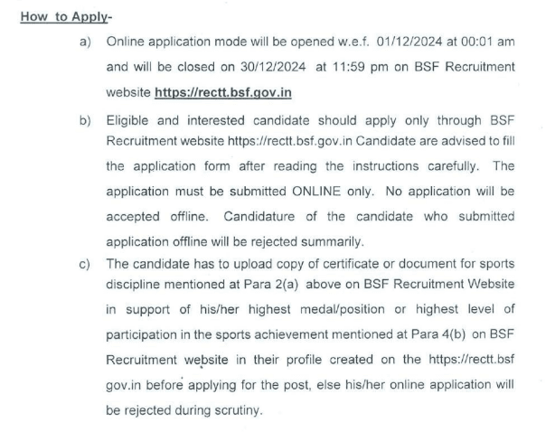 सीमा सुरक्षा दल खेळाडू भरती ही ऑनलाइन माध्यमातून सुरू करण्यात आली आहे, सर्व प्रक्रिया ही ऑनलाइन असणार आहे. BSF द्वारे जारी केलेल्या अधिकृत माहितीनुसार ऑनलाइन पद्धतीने अर्ज करायचा आहे.