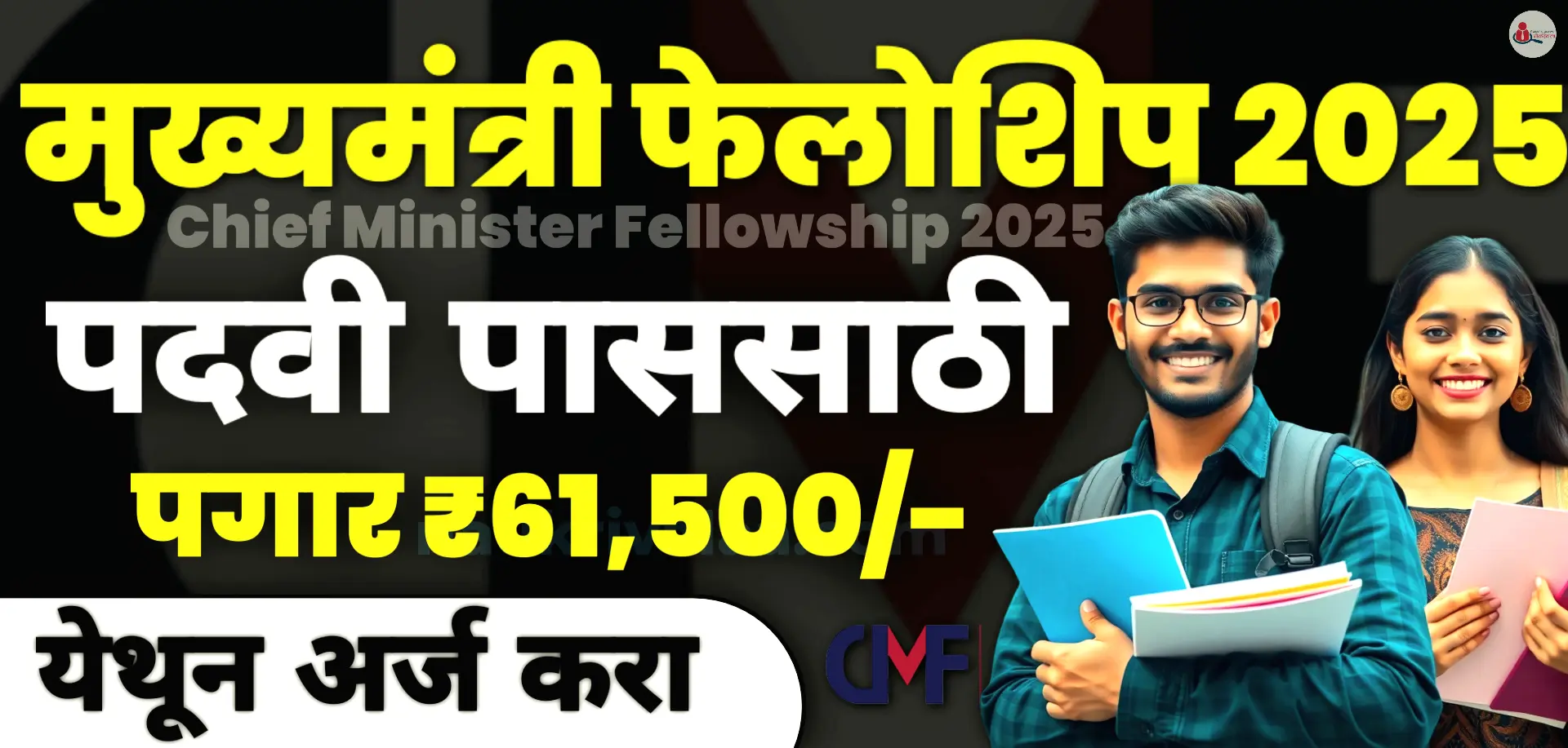 Chief Minister Fellowship 2025. नमस्कार मित्रांनो! मुख्यमंत्री फेलोशिप कार्यक्रम 2025 अंतर्गत महाराष्ट्र शासनामार्फत युवांसाठी एक खास सुवर्णसंधी उपलब्ध झाली आहे. यंदा एकूण 60 पदांसाठी ही फेलोशिप जाहीर करण्यात आली आहे. तुम्ही जर पदवीधर असाल, तर ही संधी तुमच्यासाठी खूपच उपयुक्त ठरू शकते.