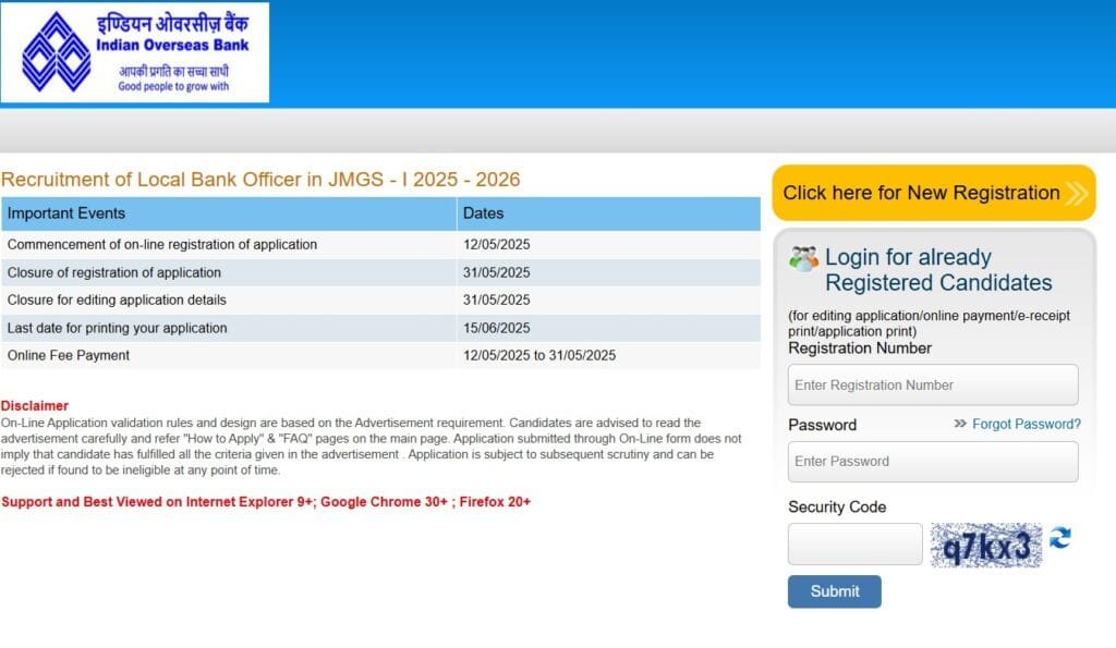 उमेदवारांनी www.iob.in या अधिकृत वेबसाइटवर जाऊन “Recruitment of Local Bank Officers – 2025-26” लिंकवर क्लिक करून ऑनलाइन नोंदणी करावी. संपूर्ण अर्ज प्रक्रिया ऑनलाईन असून अर्जाची अंतिम तारीख 31 मे 2025 आहे.