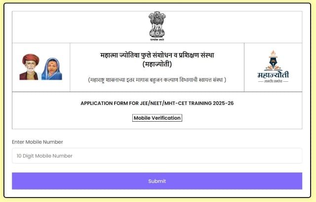 महाज्योती टॅब नोंदणी 2025 साठी अधिकृत वेबसाइट https://neet.mahajyoti.org.in/ या लिंकवर जाऊन ऑनलाइन अर्ज करता येतो. अर्ज करताना मोबाईल नंबरची OTP द्वारे पडताळणी करावी लागते.