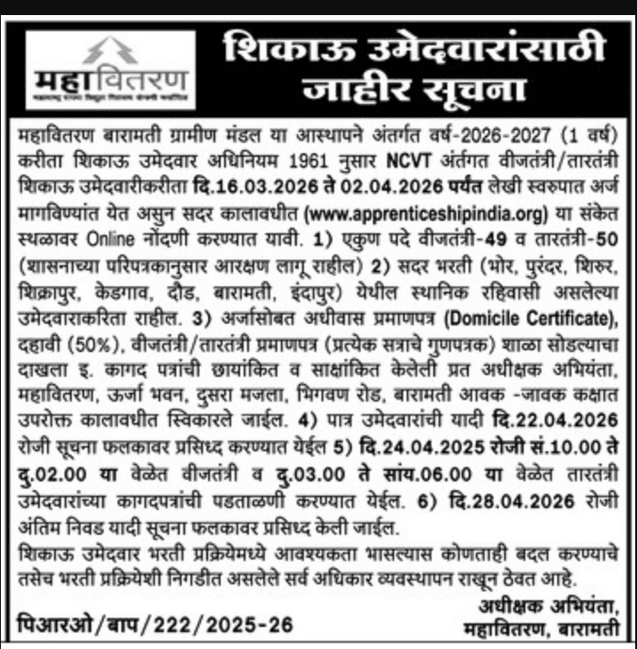 जर तुमच्याकडे आवश्यक शैक्षणिक पात्रता आणि कागदपत्रे असतील तर Mahavitaran Apprentice Bharti 2026 साठी नक्की अर्ज करा. अर्ज करण्यापूर्वी अधिकृत जाहिरात काळजीपूर्वक वाचा आणि सर्व माहिती योग्यरित्या भरा.