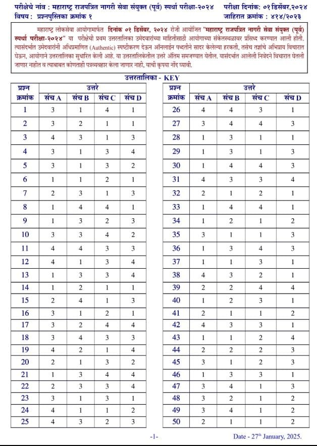 MPSC Result 2024 ची अंतिम उत्तरतालिका 27 जानेवारी 2025 रोजी जाहीर झाली आहे.