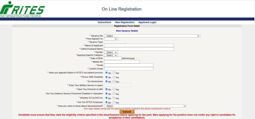 - पात्र उमेदवारांनी RITES च्या अधिकृत वेबसाइटवर (https://www.rites.com) जाऊन Career सेक्शनमध्ये उपलब्ध ऑनलाइन नोंदणी फॉर्म भरावा.