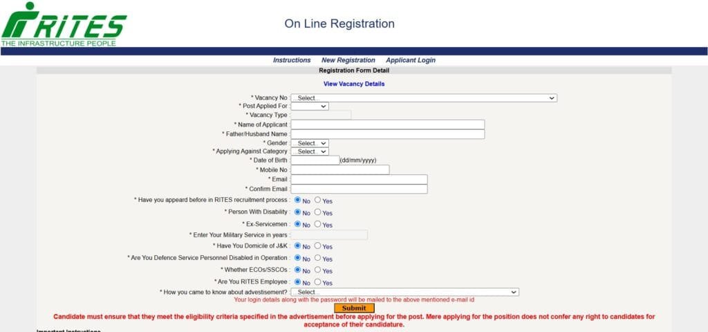 RITES Recruitment 2025 इच्छुक उमेदवारांनी RITES च्या अधिकृत वेबसाइट www.rites.com वर जाऊन “Career Section” मध्ये ऑनलाइन अर्ज भरावा. अर्ज भरल्यानंतर प्रणालीकडून “Registration No.” दिला जाईल, जो भविष्यातील संवादासाठी आवश्यक असेल.