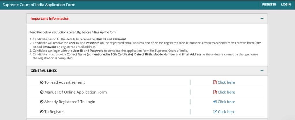 सुप्रीम कोर्ट भरतीसाठी ऑनलाइन अर्ज प्रक्रिया सोपी आणि सहज आहे. उमेदवारांनी खालील पद्धतीने अर्ज करावा: